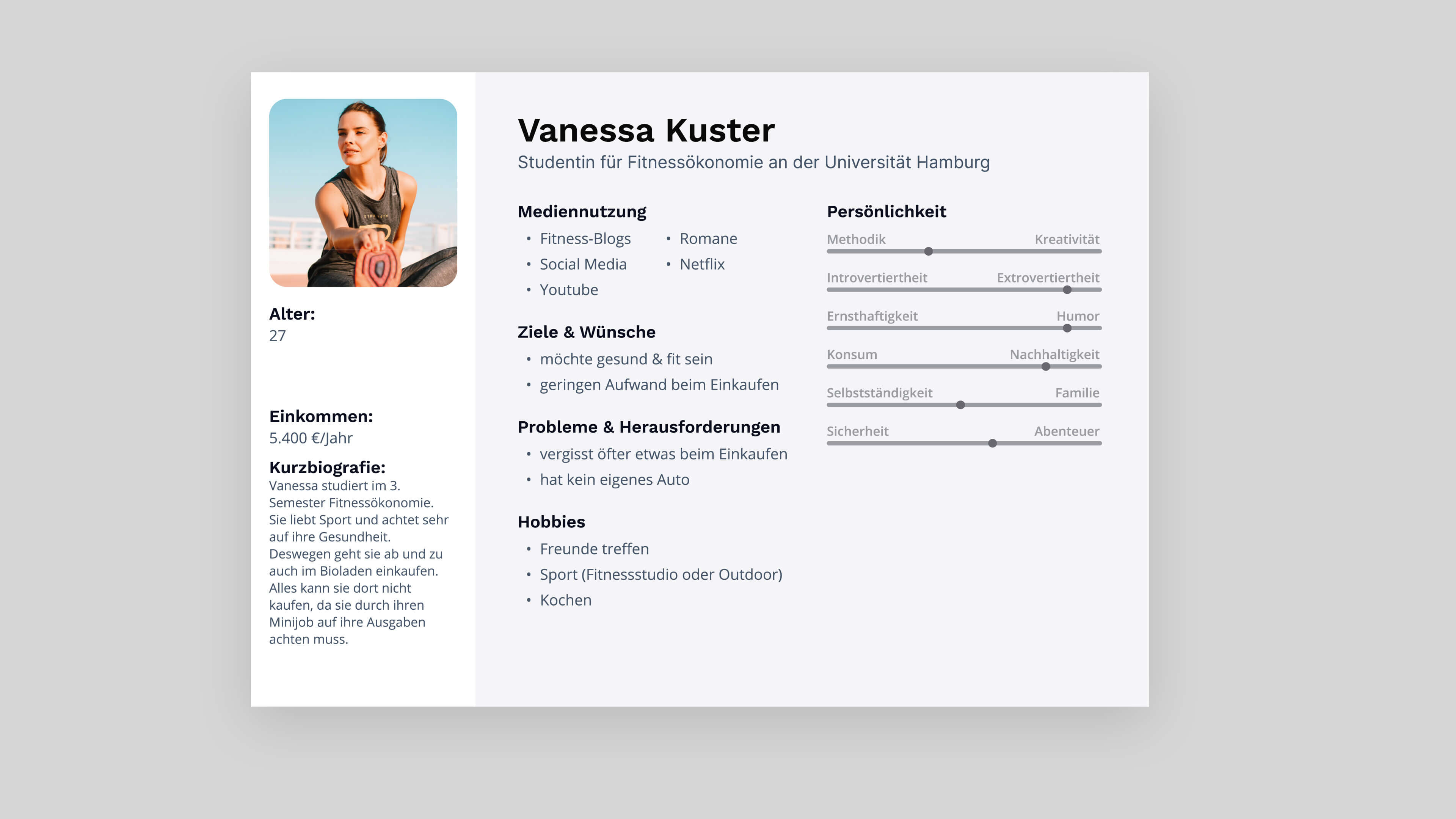 To make sure that the website fits the needs of the target group, I performed online research and developed three personas who represent Körnig’s most typical customers. Besides a short biography, the personas show information about why they buy organic food, how the target group uses the media and which goals and problems are they dealing with. Personas are an easy way to empathize with different target groups. This makes it easy to prioritize certain features and other issues against each other while keeping the user-centric design approach.